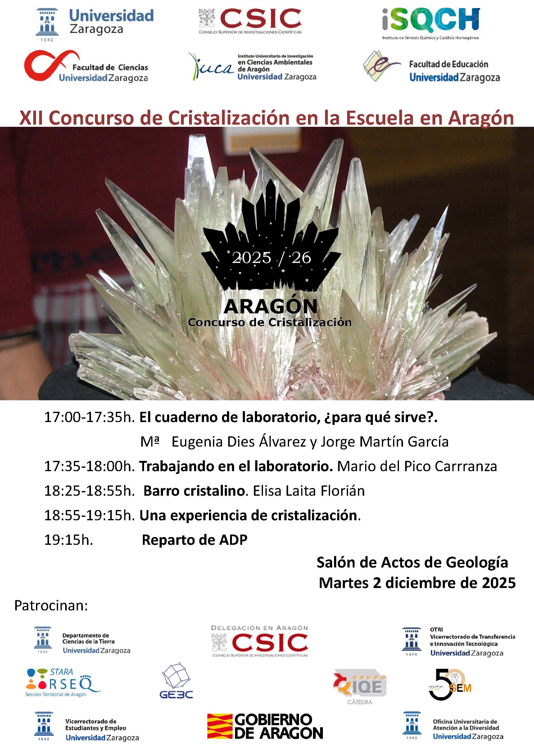 El próximo viernes 5 de mayo se celebrará la final del IV Concurso de Cristalización en la Escuela en Aragón que ha contado con alrededor de 1500 estudiantes y 80 profesores de 50 centros de Educación Secundaria repartidos a lo largo de 23 localidades diferentes de toda la geografía aragonesa (Aínsa, Alagón, Almudévar, Ateca, Binéfar, Borja, Calatayud, Cariñena, Castejón de Sos, Ejea de los Caballeros, Épila, Huesca, Maella, Mallén, Monreal del Campo, Sabiñánigo, Sariñena, Tarazona, Teruel, Utebo, Utrillas, Valderrobres y Zaragoza).