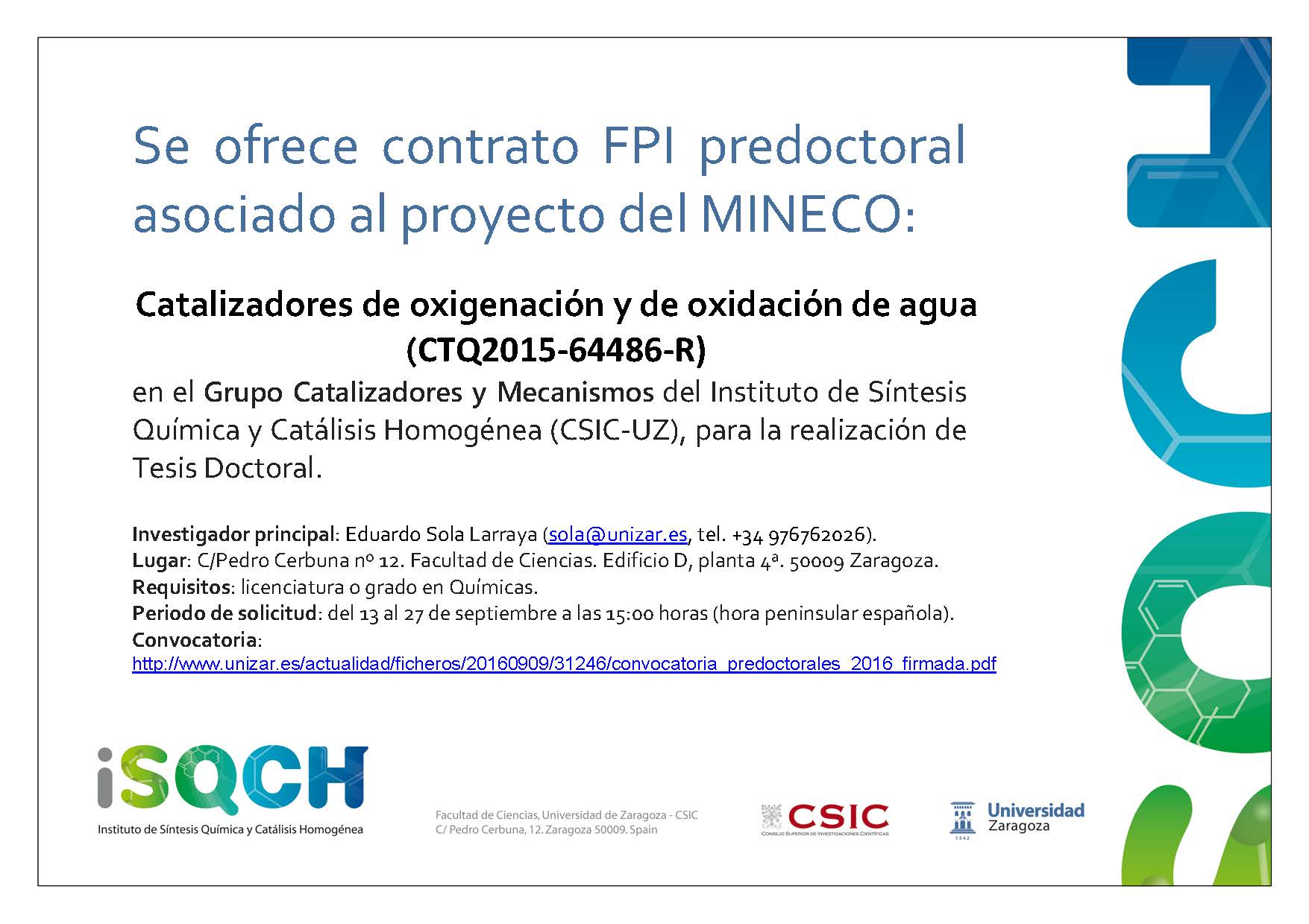 Resolución de 7 de noviembre de 2014, de la Universidad de Zaragoza, por la que se convoca por procedimiento de urgencia concurso público para la contratación de un Doctor Colaborador Junior (categoría N2) mediante contrato de trabajo de carácter temporal, en el proyecto CSD2009-00050 -DESARROLLO DE CATALIZADORES MÁS EFICIENTES PARA EL DISEÑO DE PROCESOS QUÍMICOS SOSTENIBLES Y PRODUCCIÓN LIMPIA DE ENERGÍA , con destino en el IUI Mixto de Síntesis Química y Catálisis Homogénea- ISQCH. PUI/2014-236. Plazo de presentación de solicitudes: De 11/11/2014 al 15/11/2014.