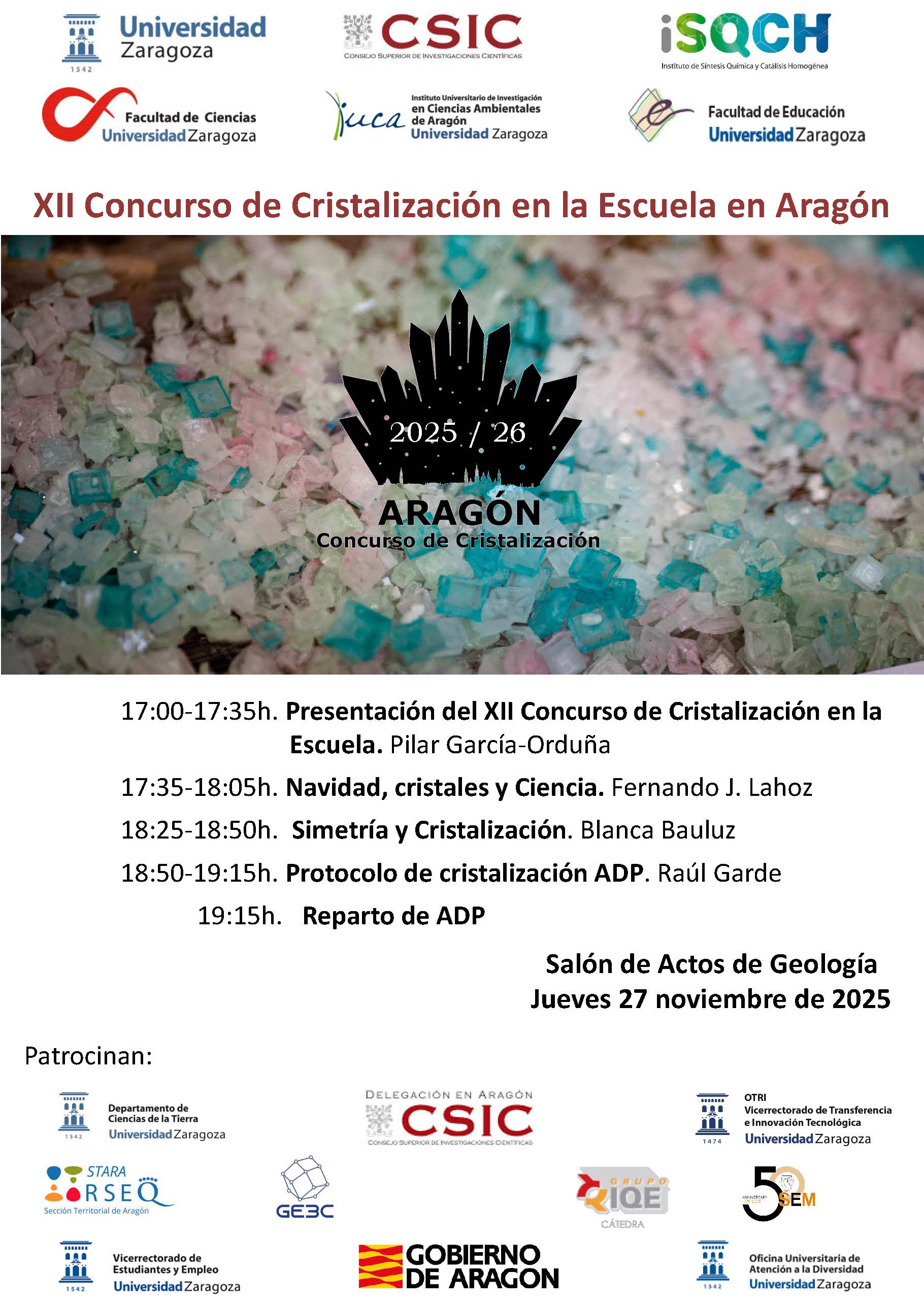 El Concurso de Cristalización, está coordinado por Blanca Bauluz, Decana de la Facultad de Ciencias de la Universidad de Zaragoza, e investigadora en el IUCA-UNIZAR y Fernando Lahoz (ISQCH), organizado por el Instituto de Síntesis Química y Catálisis Homogénea, ISQCH, el Instituto Universitario de Ciencias Ambientales de Aragón, IUCA, y las Facultades de Ciencias y Educación de la Universidad de Zaragoza y cuenta con la colaboración y patrocinio del Departamento de Ciencias de la Tierra, la Delegación del CSIC en Aragón, la Cátedra Industrias Químicas del Ebro, el Grupo Especializado en Cristalografía y Crecimiento Cristalino (GE3C), la Sociedad Española de Mineralogía (SEM), la Sección Territorial de Aragón de la RSEQ, el Vicerrectorado de Estudiantes y Empleo, el Gobierno de Aragón, la OTRI–Vicerrectorado de Transferencia e Innovación Tecnológica y la Oficina universitaria de Atención a la Diversidad de la Universidad de Zaragoza.