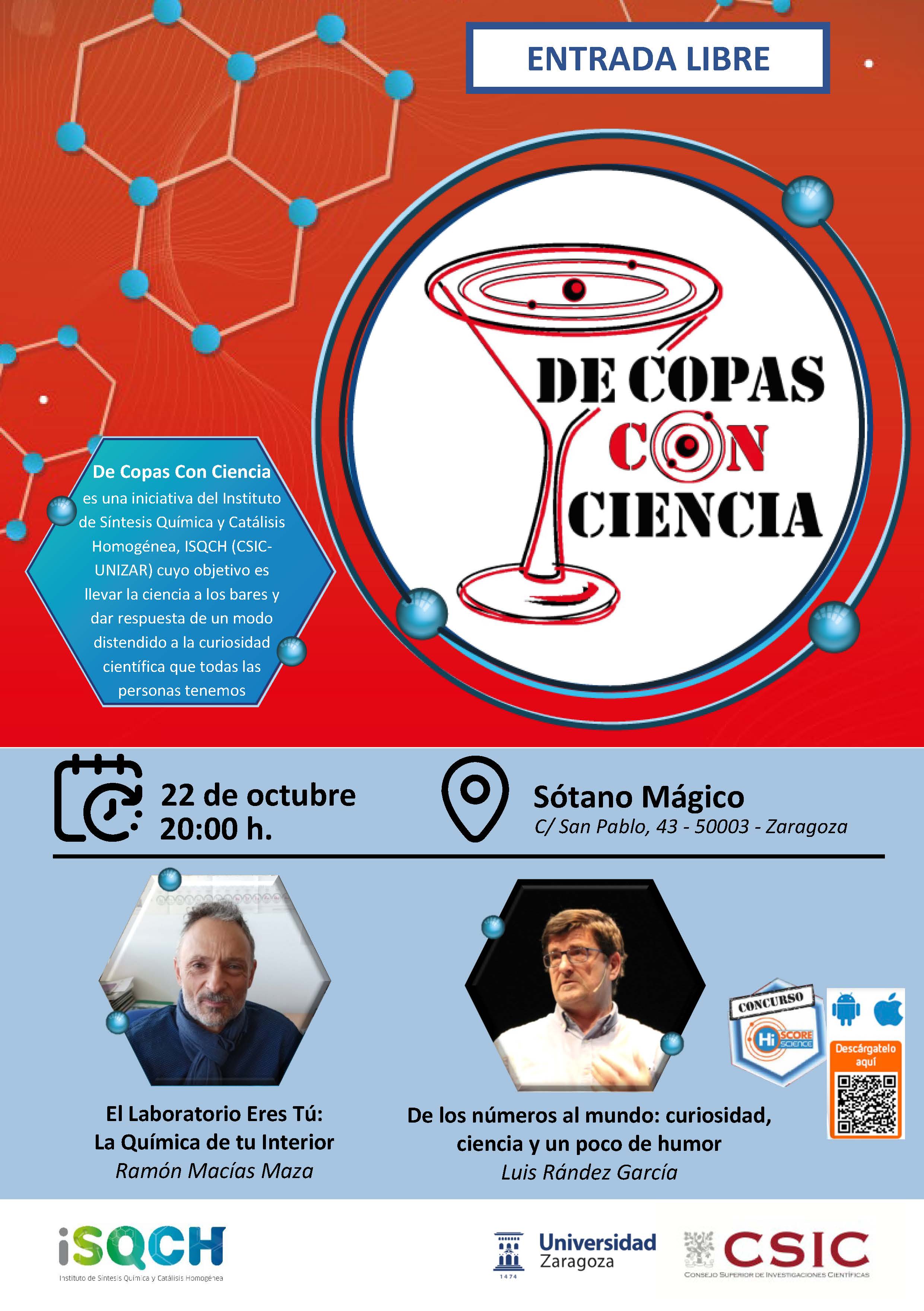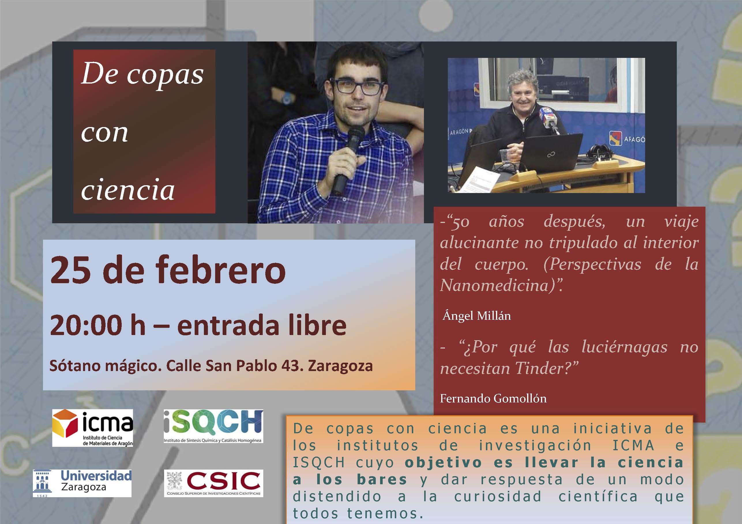 Tras el éxito de la primera edición comienza la segunda temporada de “De copas con Ciencia”, una actividad que pretende acercar la ciencia a los bares de forma divertida. De copas con ciencia es una iniciativa de los institutos de investigación, ISQCH (Instituto de Síntesis Química y Catálisis Homogénea) e ICMA (Instituto de Ciencia de Materiales de Aragón) ambos centros mixtos CSIC – Universidad de Zaragoza, que pretende saciar la curiosidad científica de la población en general de un modo distendido, ameno y divertido en el tiempo de ocio acercándola a los bares. La actividad está dirigida a toda la población con curiosidad científica desde estudiantes de instituto hasta personas de la tercera edad y sin formación específica en ciencias.
