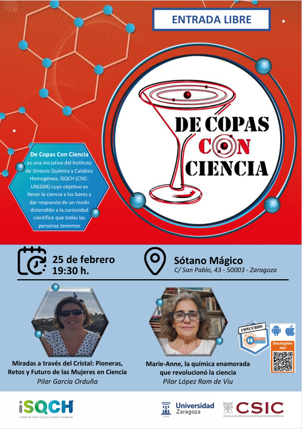 “De copas con ciencia” es una actividad de divulgación que pretende sacar la ciencia de los laboratorios y acercarla al tiempo de ocio de forma divertida. En esta ocasión, nos unimos a la celebración del Día Internacional de la Mujer y la Niña en la Ciencia, visibilizando el papel de las mujeres en la investigación de la mano de dos de nuestras mujeres Mª Pilar García Orduña y Pilar lópez Ram de Viu y, además, contaremos con un torneo especial con preguntas sobre mujeres con nuestro juego Hi Score Science
